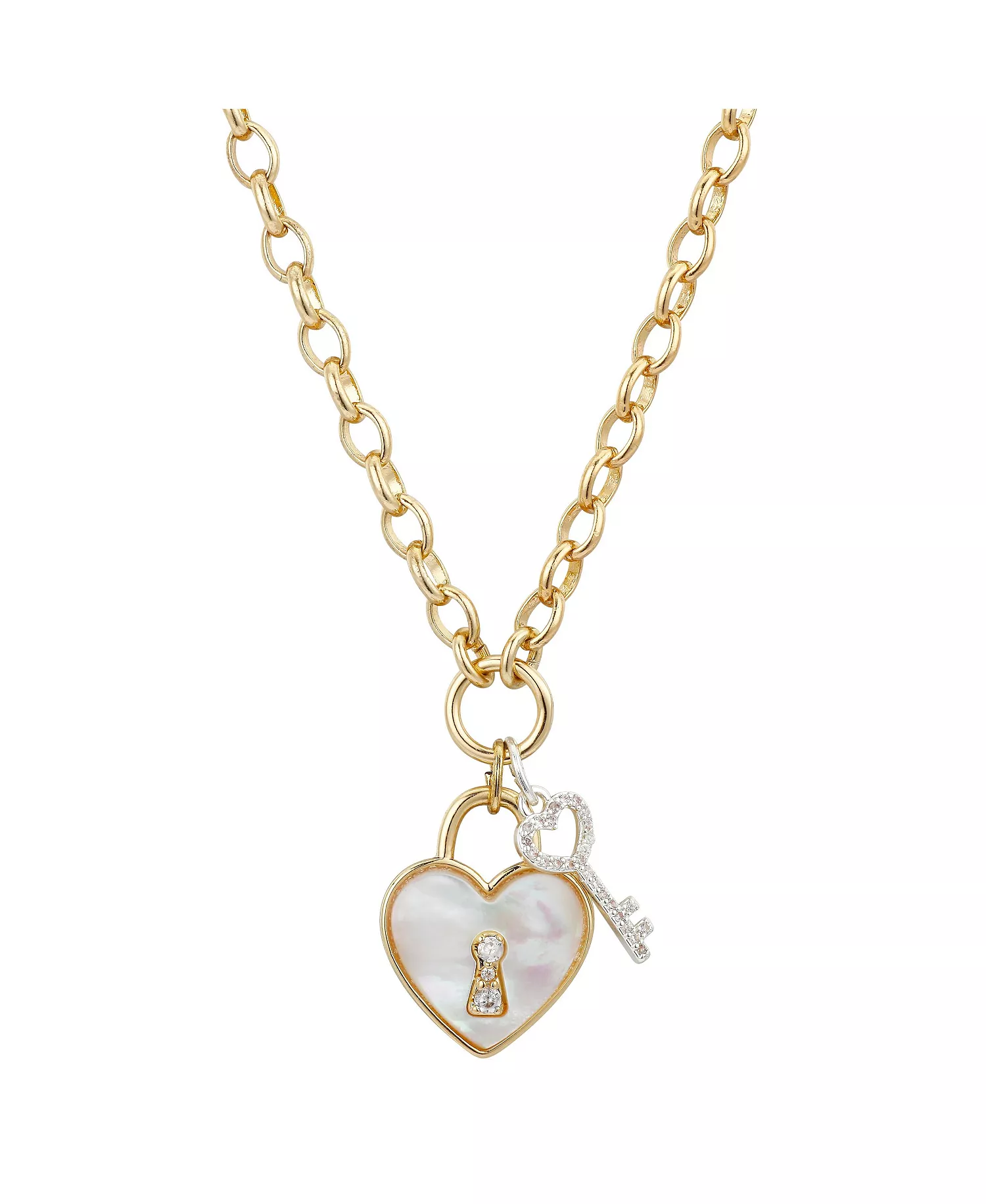 Cubic Zirconia Key and Genuine Mother of Pearl Inlay Stone Heart Necklace