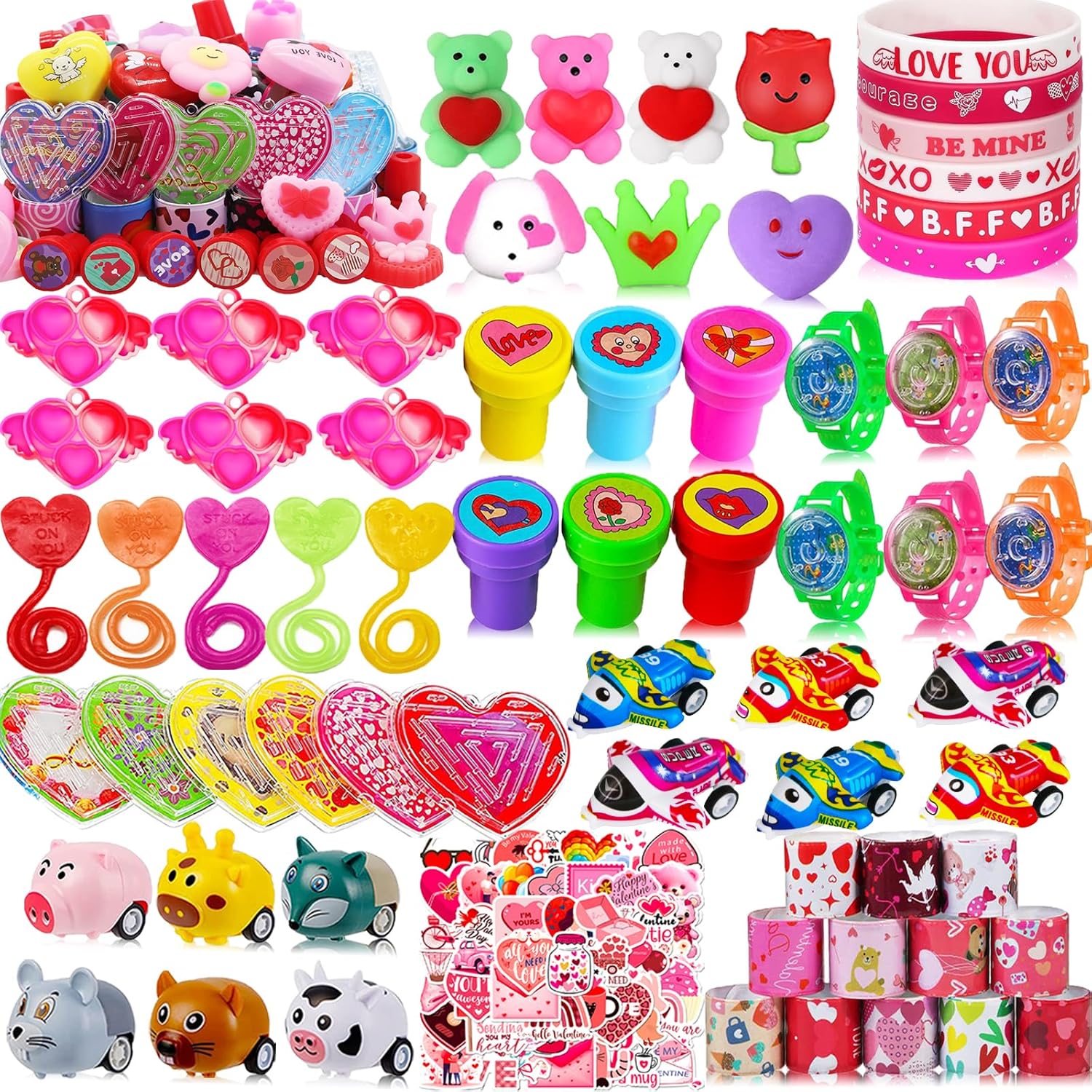 - 【Valentines Party Favors for Kids】: The Valentine Kids Party Favors Set Toys for kids Included 60 stickers, 6 stampers, 6 slap bracelets, 6 heart shape maze puzzles, 6 silicone bracelets, 6 pop heart shape keychains, 6 mochi squishy, 6 heart shape sticky hands, 6 watch maze, 12 mini rings, 6 animal pull back cars, 6 pull back planes. These are the perfect Valentine’s Day gifts for kids!
