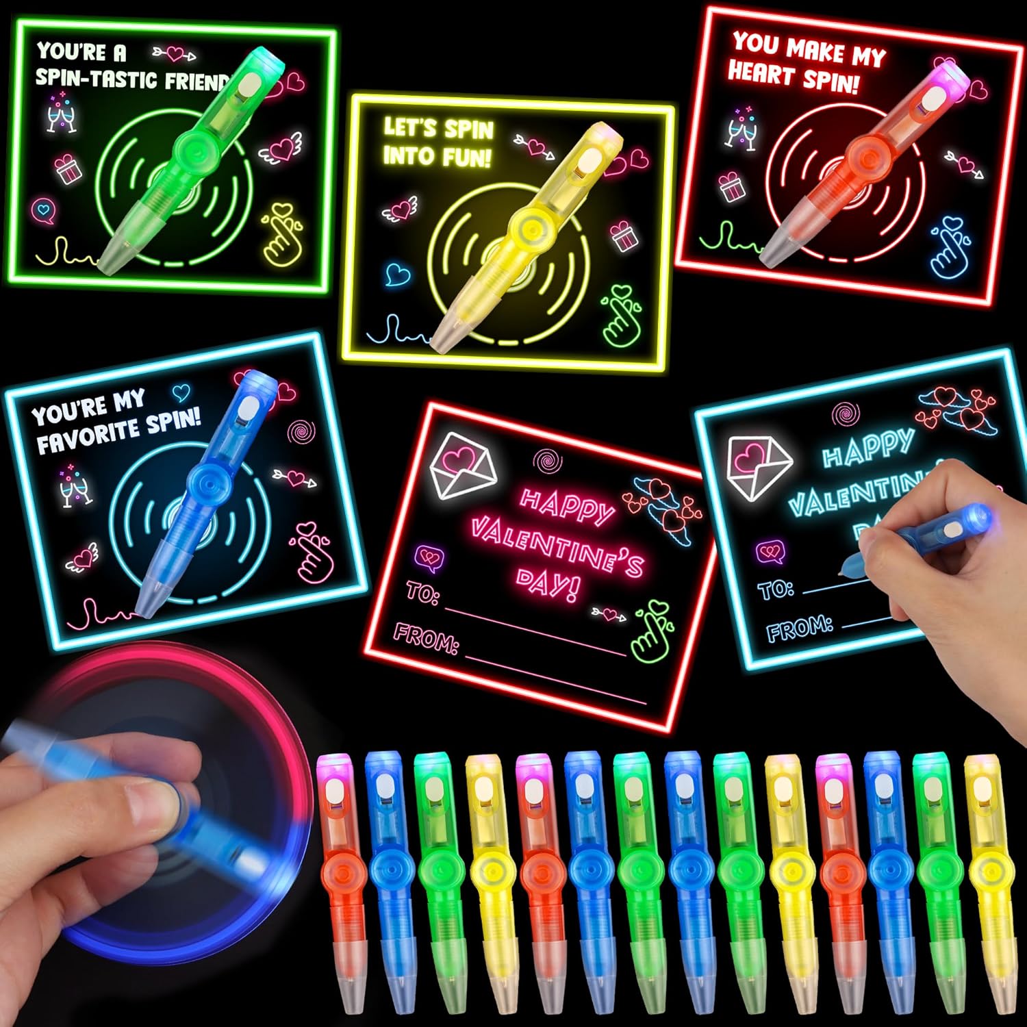 - Exciting Light-Up Spinner Toys – Each fidget pen toy features flashing LED lights that create a mesmerizing effect while spinning. Perfect for keeping kids engaged, improving hand-eye coordination, motor skills, and focus, and adding a festive, interactive element to Valentine’s Day fun.