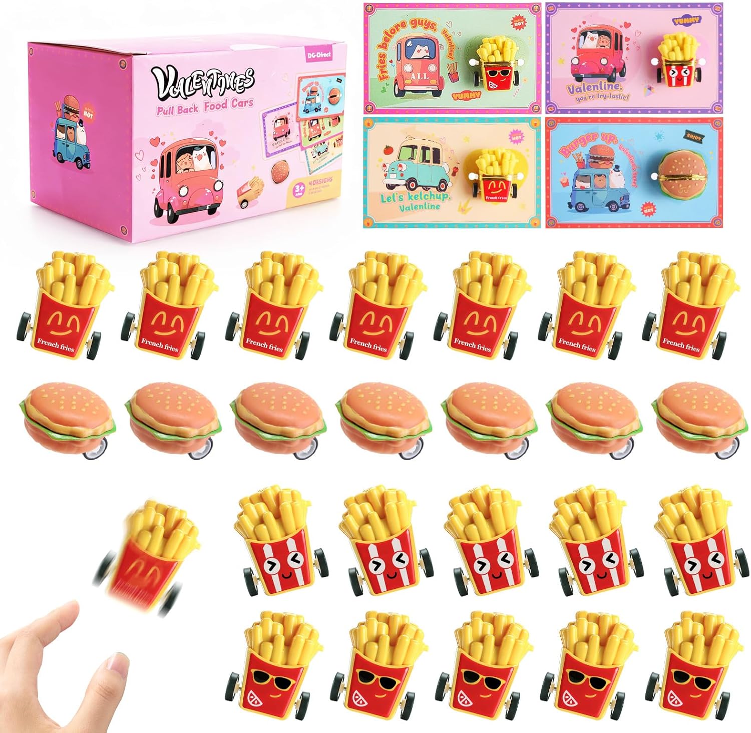 - 【Super Value Classroom Pack】Includes 28 Valentine cards and 28 pull back burger fries car toys, providing plenty for kids’ classroom exchanges. A convenient option for Valentine’s Day celebrations at school.