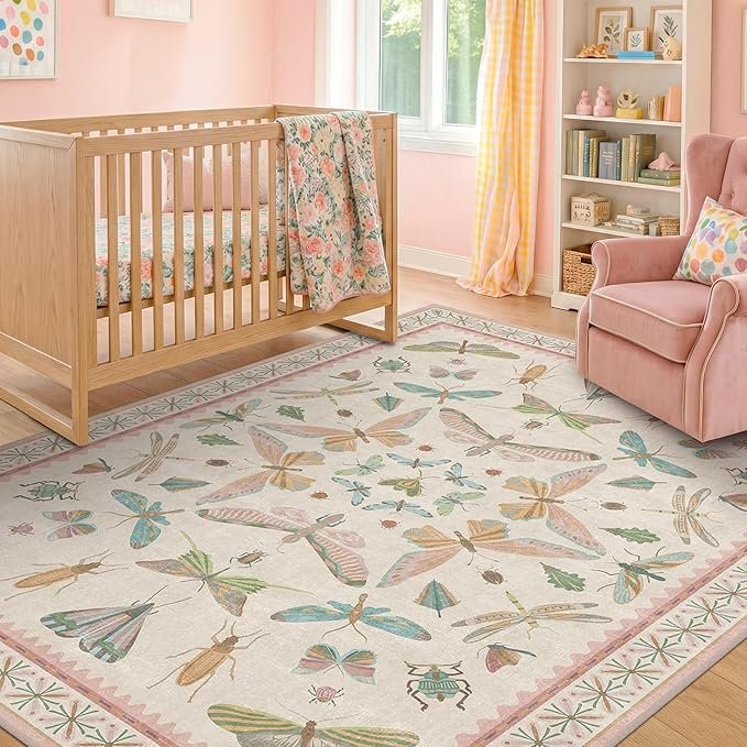 • Whimsical Nature Aesthetic: Brighten your space with this washable rug featuring delicate butterflies, moths, beetles & dragonflies on a soft ivory base. A pastel palette of blush pink, sage green, sky blue, and golden mustard offers cheerful, vintage charm. Its symmetrical layout and scalloped edge echo antique scientific illustrations, blending playful character with timeless design. Framed by a warm pink and green floral border, it’s perfect for girls bedroom, nurseries, or boho interiors