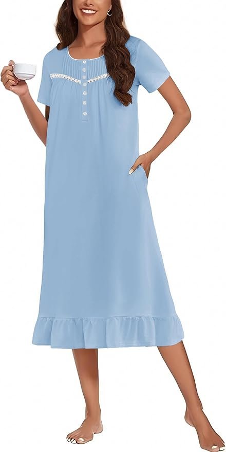 • 【Design】Ladies nightgown feature short sleeve, round neck with tiny lace trim, front pleat and mid-calf length ruffled hem will make you more charming.The front exquisite floral hollow design create a breathable and visually appealing look, adding a touch of elegance and making it stand out from basic sleepwear.