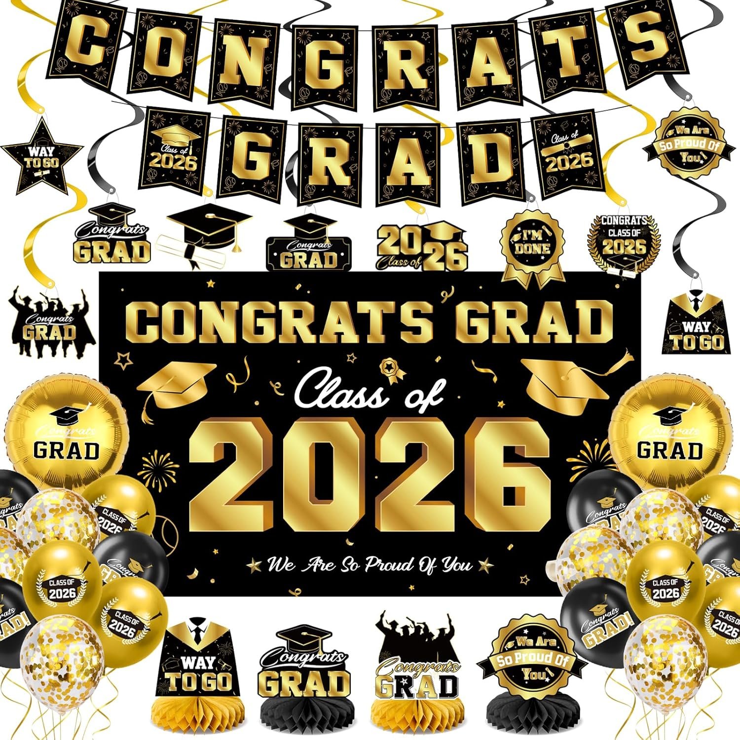• Complete Graduation Party Set: Are you tired of searching various stores for 2026 graduation party supplies? Look no further than the HOMDAILY graduation party decorations. Complete your graduation presentation with our diverse decorative accents, including a 1 “CONGRATS GRAD” banner, 1 class of 2026 Backdrop, 2 shaped foil balloons, 18 black & gold balloons, 6 hanging swirls, and 4 honeycomb centerpieces. No need to shop for multiple items!