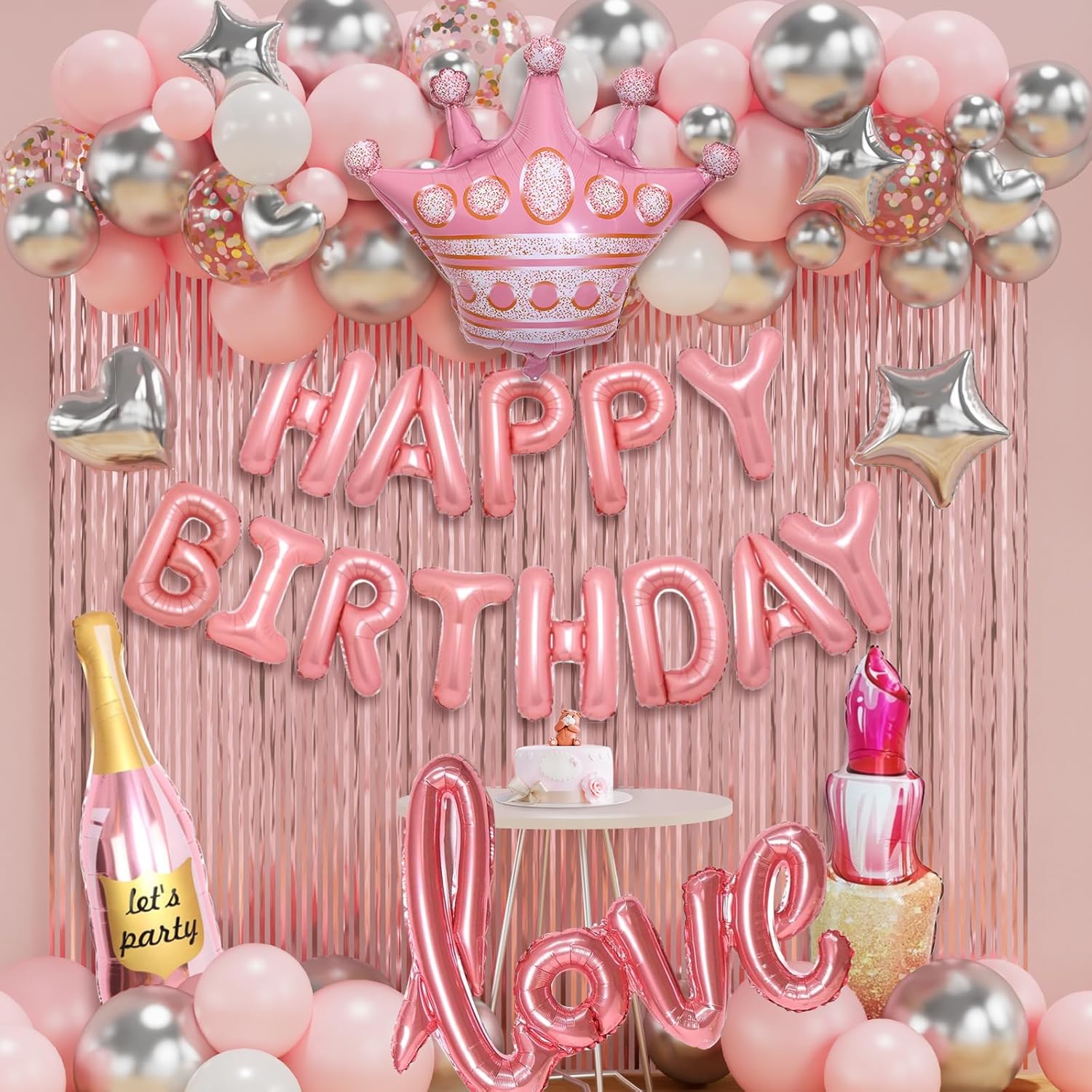 - Pink Birthday Decorations: you will get metallic silver balloon 12 “*10, 10” *10, 5 “*10, Maca powder latex balloon 12” *10, 10 “*10, 5” *10, white latex balloon 10 “*5, pink silver and gold confetti balloon 12” *5, medium lipstick aluminum film *1, Pentacle aluminum film (silver) 10 “*1, 5” *2, 10 inch heart-shaped aluminum film (silver) 10 inch *1, 5 inch * 2,1 meter pink rain curtain * 2,16 inch birthday letter aluminum film set*1, large champagne bottle aluminum film balloon *1, medium five star crown (pink)*1, 30 inch medium LOVE one-piece aluminum film (pearl powder)*1