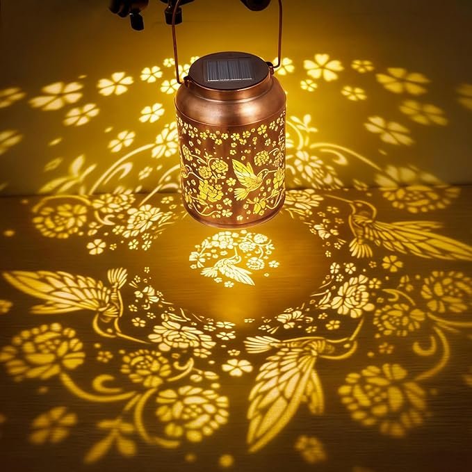 - Graceful Decorative Design: This solar lantern features a vintage cutout hummingbird design. Its warm glow and golden copper finish create a captivating lighting effect. The solar lantern not only adds a touch of sophistication to your garden decor, patio, balcony, or other indoor or outdoor spaces, but is also the perfect choice for creating a unique atmosphere for nighttime events like Valentine’s Day, Christmas, and birthday decorations for women.